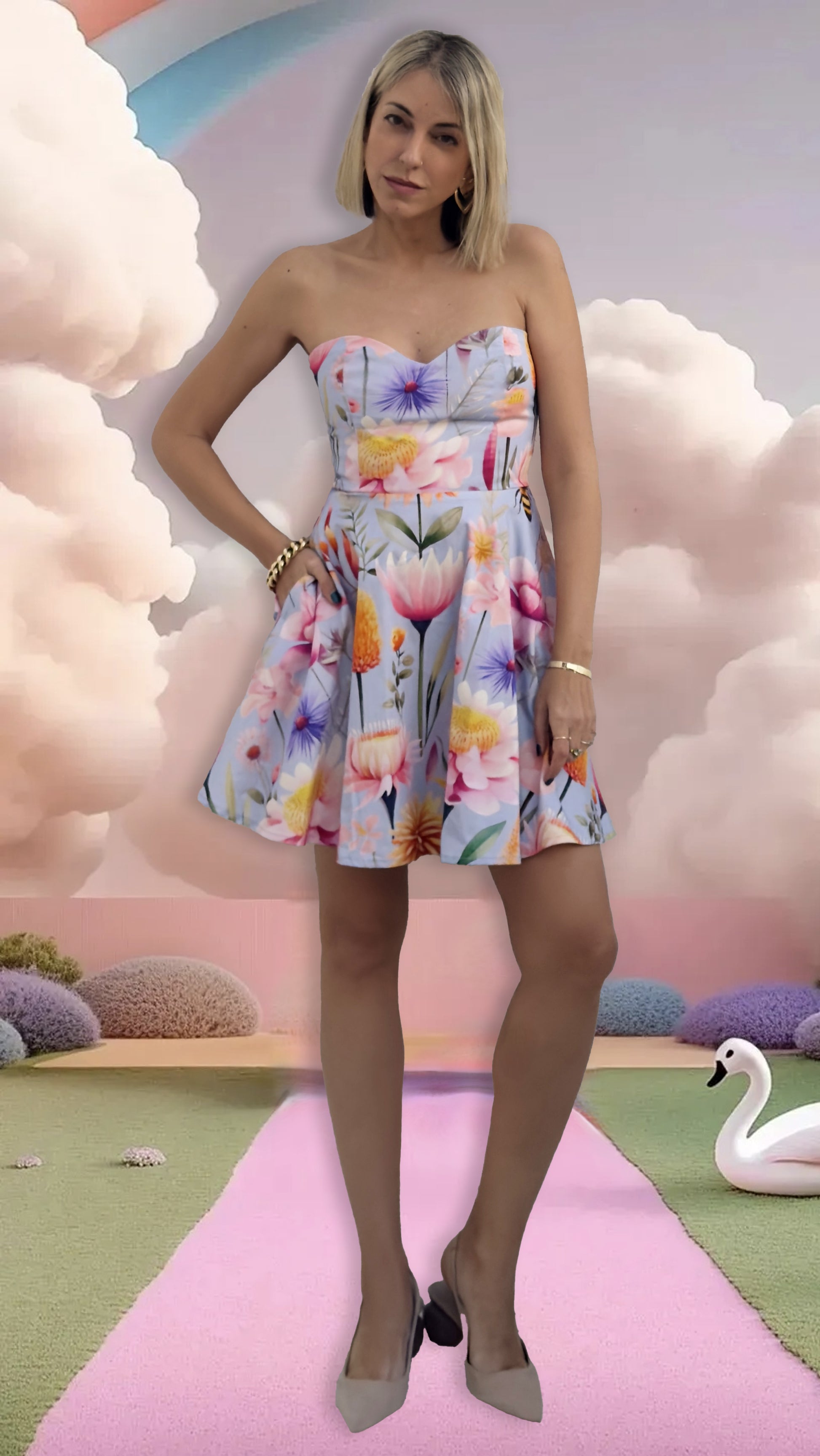 1. גזרת סטפלס ומחשוף לב בשילוב חצאית קלוש מתנפנפת